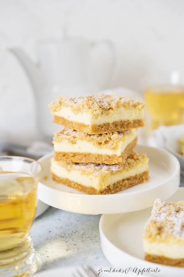 zitronen cheesecake schnitten mit crunchy streuseln zimtkeks und apfeltarte